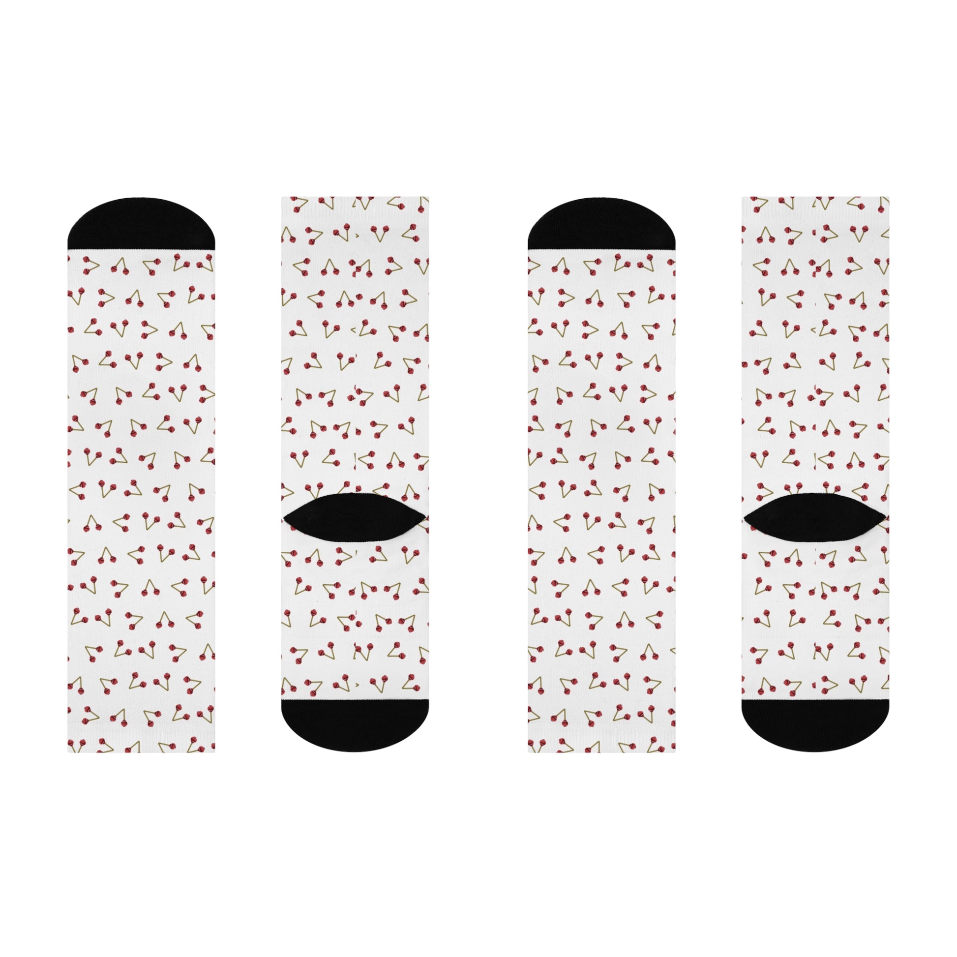 These crew-length dress socks feature a clean ivory base patterned with deep red mallets . Reinforced black heels and toes give them that touch of edge, while the repeating motif keeps your steps playful yet purposeful.